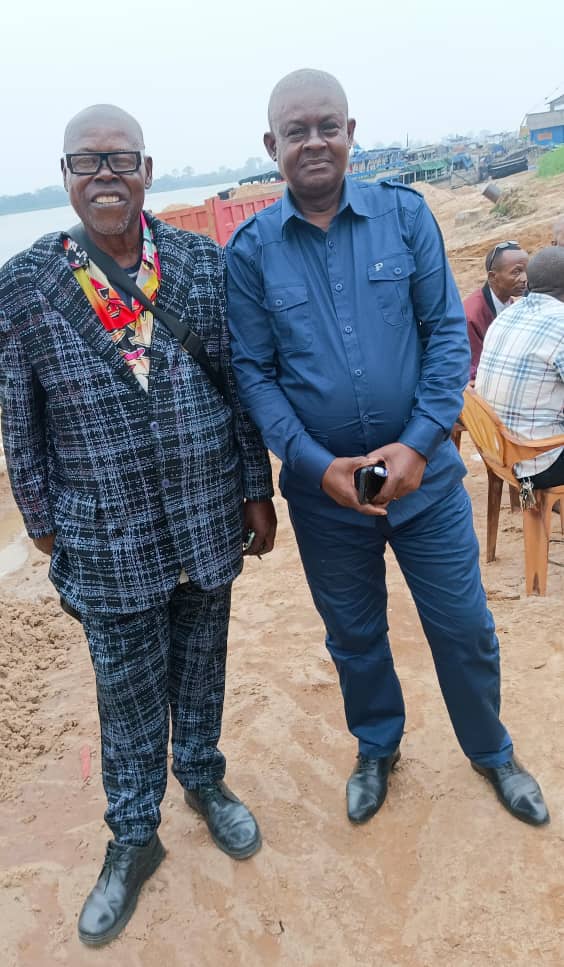 Le directeur de rédaction de MediaActualité, Jean-Paul ILopi Bokanga, posant avec le CT Jean-Jacques Muwoko, analyste culturel et politique, ancien Dircab d’ avant-dernier président de l’Assemblée Provinciale du Kwilu, au bord de la rivière Kwilu-Kwango, non loin du Port Bac de la ville de Bandundu, le chef-lieu de la province du Kwilu.