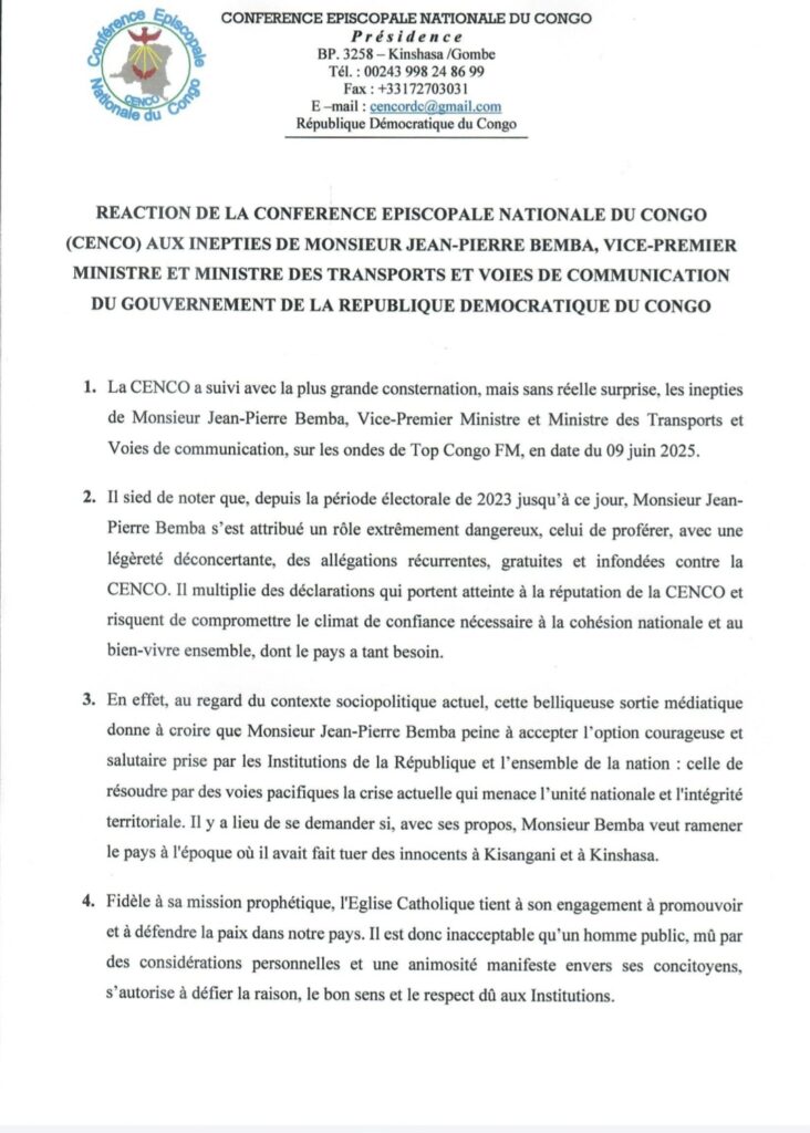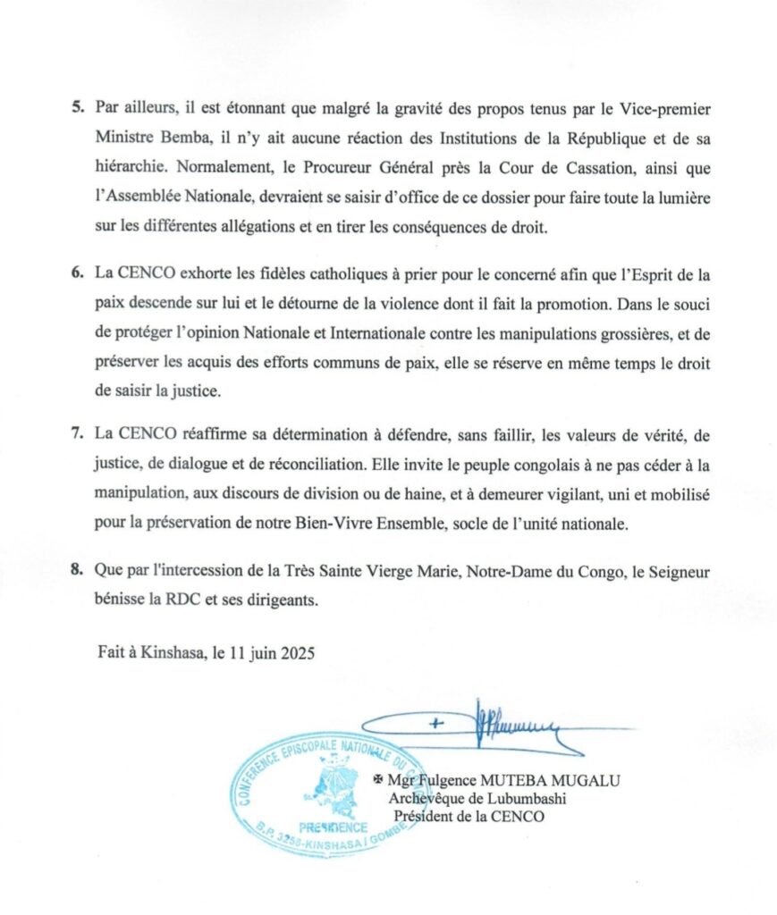 Cette sortie médiatique qualifiée de belliqueuse par la Conférence Episcopale Nationale du Congo,CENCO, donne à croire ,d’après Mgr Fulgence Muteba Mugalu, que Jean Pierre Bemba peine à accepter l’option courageuse et salutaire prise par les institutions de la République et l’ensemble de la nation: celle de résoudre par des voies pacifiques la crise actuelle qui menace l’unité nationale et l’intégrité territoriale.