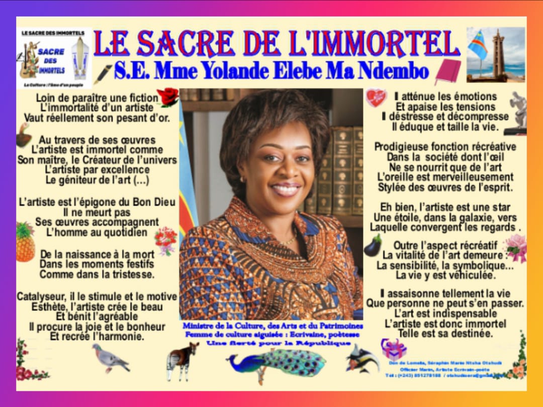 Le Sacre de l’Immortel, prestigieuse distinction culturelle, a été attribué à Mme Yolande Elebe Ma Ndembo, poétesse de renom et actuelle Ministre de la Culture, des Arts et du Patrimoine.